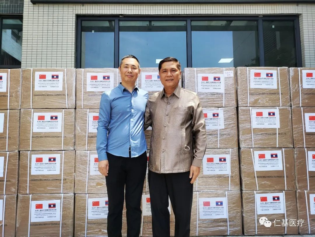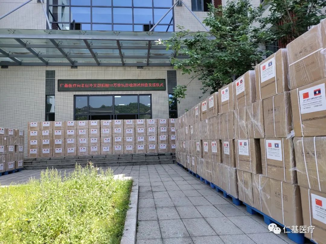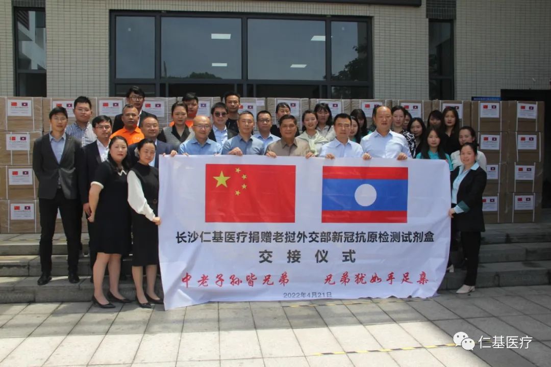 2022年4月21日上午,長(zhǎng)沙仁基醫(yī)療器械有限公司(以下簡(jiǎn)稱:仁基醫(yī)療)向老撾外交部捐贈(zèng)10萬(wàn)人份抗原檢測(cè)試劑盒交接儀式在仁基醫(yī)療公司大樓前坪正式舉行。面對(duì)全球疫情,為堅(jiān)決打贏疫情防控這場(chǎng)大仗,積極響應(yīng)、貫徹落實(shí)黨和國(guó)家的號(hào)召,仁基醫(yī)療本著中老一家親的理念,向老撾外交部捐贈(zèng)了10萬(wàn)人份新型冠狀病毒(2019-nCoV)抗原檢測(cè)試劑盒。老撾人民民主共和國(guó)駐長(zhǎng)沙總領(lǐng)事館代表老撾外交部親臨接收本批捐贈(zèng)物資。本批捐贈(zèng)物資將由專車(chē)運(yùn)抵成都再經(jīng)磨憨鐵路口岸直接運(yùn)抵老撾首都萬(wàn)象。